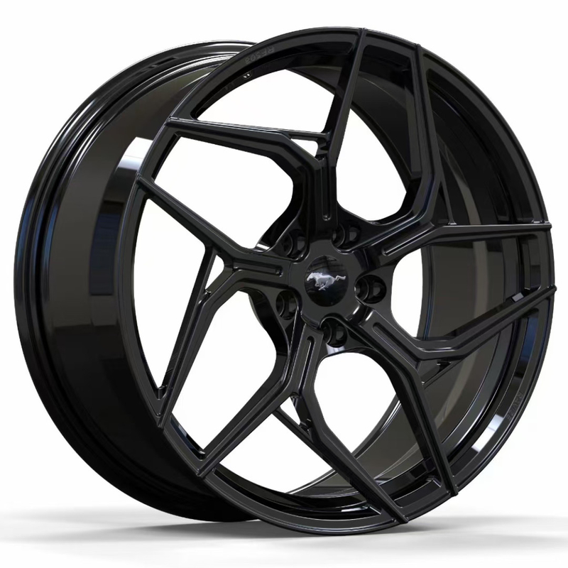 Glanszwarte gesmede velgen speciaal ontworpen voor Ford Mustang, gestroomlijnd spaakontwerp, uitgehold in de spaken, 5x114.3 pcd, 6061-T6 aluminiumlegering zorgt voor ultrahoge sterkte en duurzaamheid